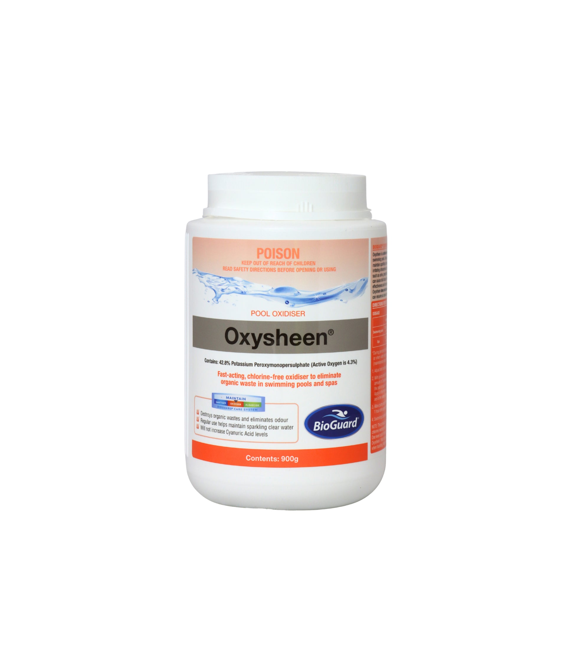 BioGuard Oxysheen is a chlorine-free, stabiliser-free oxidiser treatment for swimming pools. It is easy to use, fast dissolving and swimming can resume one hour after treatment.