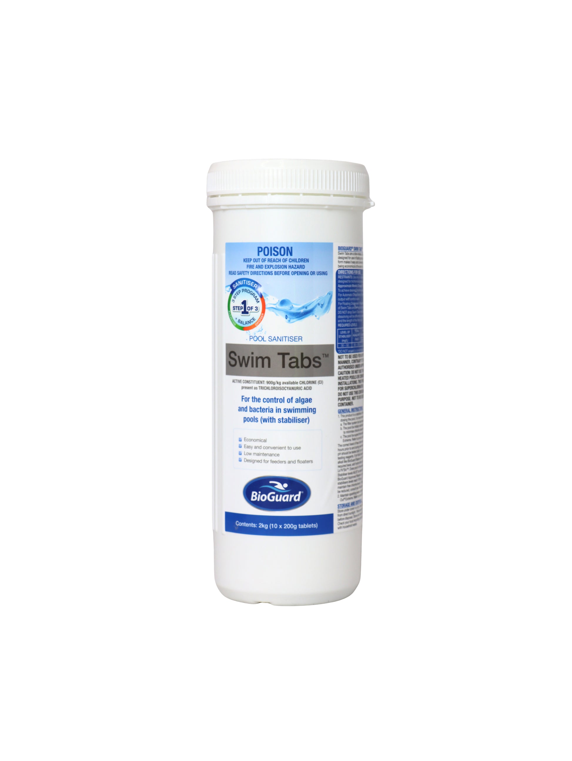BioGuard Swim Tabs are stabilised 200 gram trichlor tablets that can be used in automatic feeders and some floaters for constant chlorination.